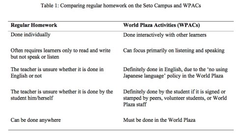 We would like to acknowledge that the ideas in this paper are not just our own, but belong to all of the Nanzan University Seto campus English program teachers, particularly Yoshikazu C. Watanabe, who originally conceived the World Plaza concept, and David Barker, the first World Plaza coordinator. We would also like to acknowledge Monkasho Gendai GP funding for this project.