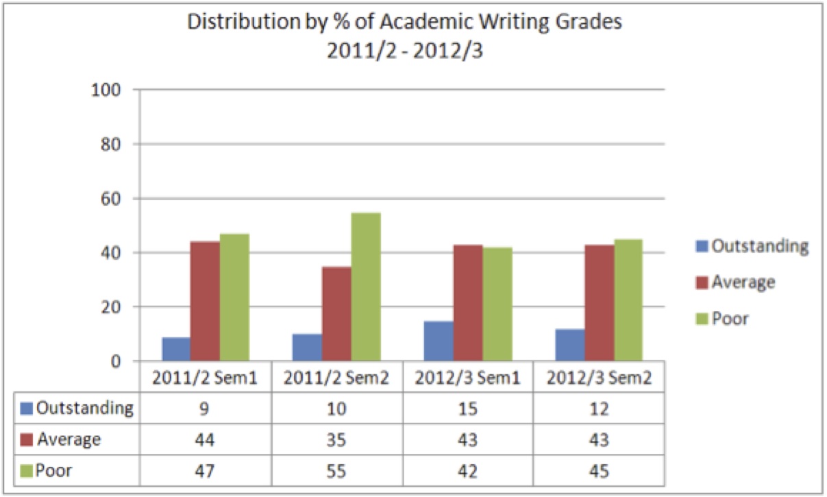 In Jamaica, lecturers at tertiary-level institutions are confronted with similar challenges as their international counterparts. Virtue (2013) highlights the abysmal communication and abominable language skills of Jamaican tertiary students with many of them repeatedly registering for, pursuing and failing these communication modules during their university lifespan. Similarly, Hamilton (2010) highlights that forty per cent (40%) of tertiary level students fail English-based communication courses, with the majority of the remaining sixty per cent (60%) struggling to achieve passing grades. At the research site, the distribution of students’ academic writing grades for the last four semesters (academic year 2011/12 – semesters 1 and 2 and academic year 2012/13 – semesters 1 and 2) corroborate the reports of Virtue and Hamilton (Figure 1). Please note that the research site has a pass mark of 50% with a letter equivalent of C. For the purposes of this paper, the student performance has been divided into three categories: outstanding (ranging from B to A), average (C- to B-) and poor (F to C-).