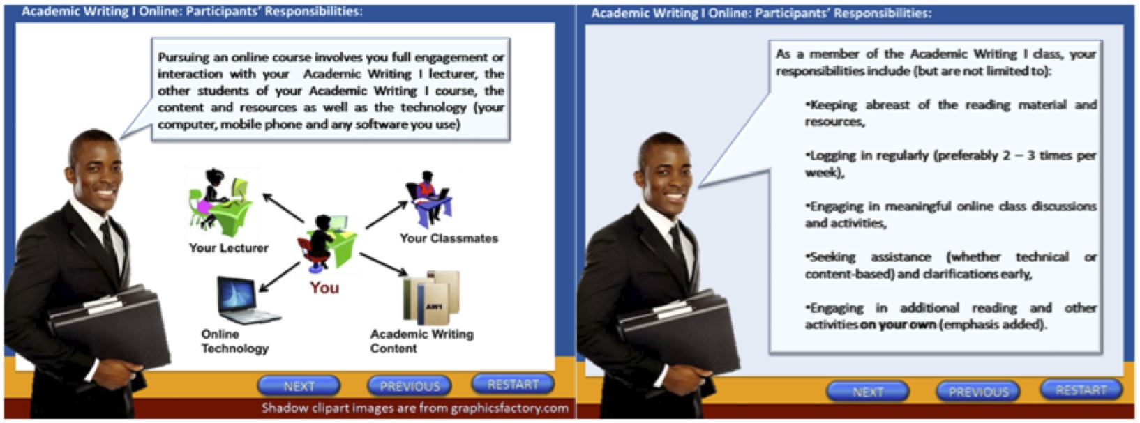 A team of online assistants assuming the role of virtual onscreen coaches (also known as pedagogical agents) were built into the module in order to deliver the interactive tutorials and provide online support with the writing content. The virtual coaches use conversational tones in their engagements with the students (Clarke & Mayer, 2008). The pedagogical agents were also included in the customised module to reduce students’ dependence on the teacher as sole information provider. Figure 8 provides screenshots of the online pedagogical agents used in the course.