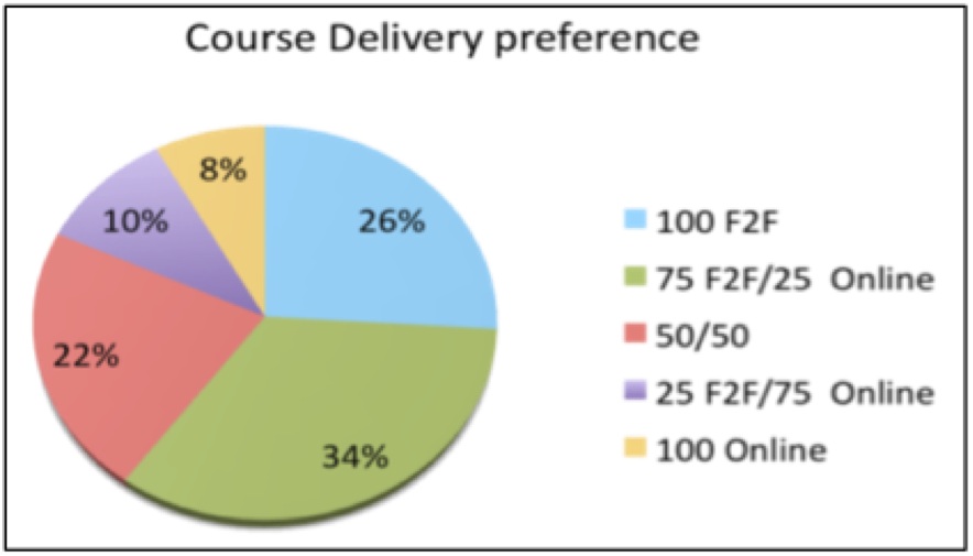 In addition to the writing challenges that Jamaican tertiary-level students face, they are less than au fait in the online classroom. Stewart-McKoy (in press), in her research which aimed to generate Jamaican tertiary students’ digital profiles in order to design and develop relevant virtual learning environments, found that more than sixty per cent (60%) of the research participants were not very comfortable creating online content nor engaging in academic searches which took them beyond Wikipedia and Google. A combined sum of sixty percent (60%) of the respondents preferred face-to-face course delivery to online instruction (Figure 2) and more than seventy per cent (70%) of respondents showed a high affinity for teacher directed instruction (lectures: 73% and teacher-led tutorials: 71%).
