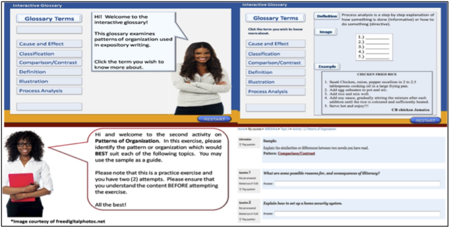 Interactive learning tutorials and activities which reflect the e-learning principles of Clarke and Mayer (2008) and Gagné’s nine events of instruction (Gagné, Briggs & Wager, 1992) were included in the customised environment to address students’ boredom and short attention span. Additionally, in order to avoid information overload and to prolong students’ time on tasks, the module units were broken down into manageable sessions (See Figure 9 for screenshots of interactive activities.