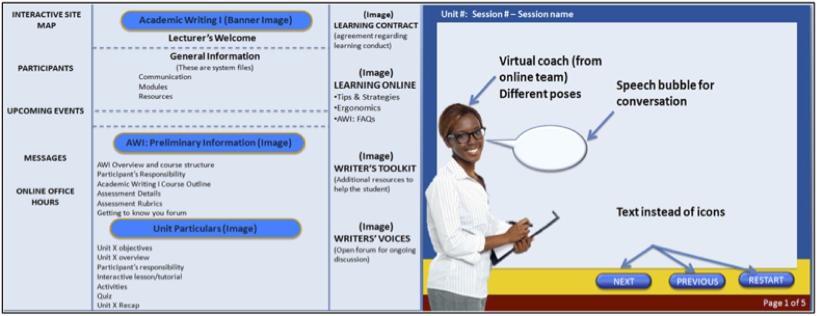 After students’ characteristics and learning needs were mapped to the implications of online instruction and guided by the literature of design, e-learning and pedagogic principles, the key components relevant to spark students’ interest, ensure active participation and encourage self-direction in an online academic writing were documented for design and development purposes.