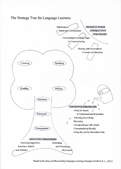 Self-regulation has attracted teachers’ and researchers’ attention recently in second language education as well as in general education. Although there have been various arguments about definitions about the effectiveness of self-regulation and learning strategies (Gu, 2012; Ranalli, 2012), the Strategic Self-Regulation (S²R) model covering the three important dimensions of language learning, cognitive, affective, and sociocultural-interactive (Oxford, 2011), can be a convenient tool in practice. The Strategy Tree for Language Learners was created drawing on the S²R model with the purpose of applying it as an instructional tool to advising and teaching. Learners need to know what to learn and how to learn to proceed with learning effectively, and the Strategy Tree can help them see the whole picture of language learning, raise their awareness of learning strategies, and consequently develop self-regulation to proceed with their learning autonomously, which were described as metacognitive, meta-affective, and meta-SI (i.e., sociocultural-interactive) strategies in Oxford (2011).