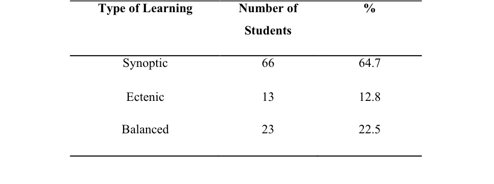 As shown in Table 2, analyses for the overall learning preferences revealed that most of the users were synoptic learners. Participants were found to be the learners who tend to rely on their intuitions and subconscious processing most commonly, as explained by Leaver et al. (2005).
