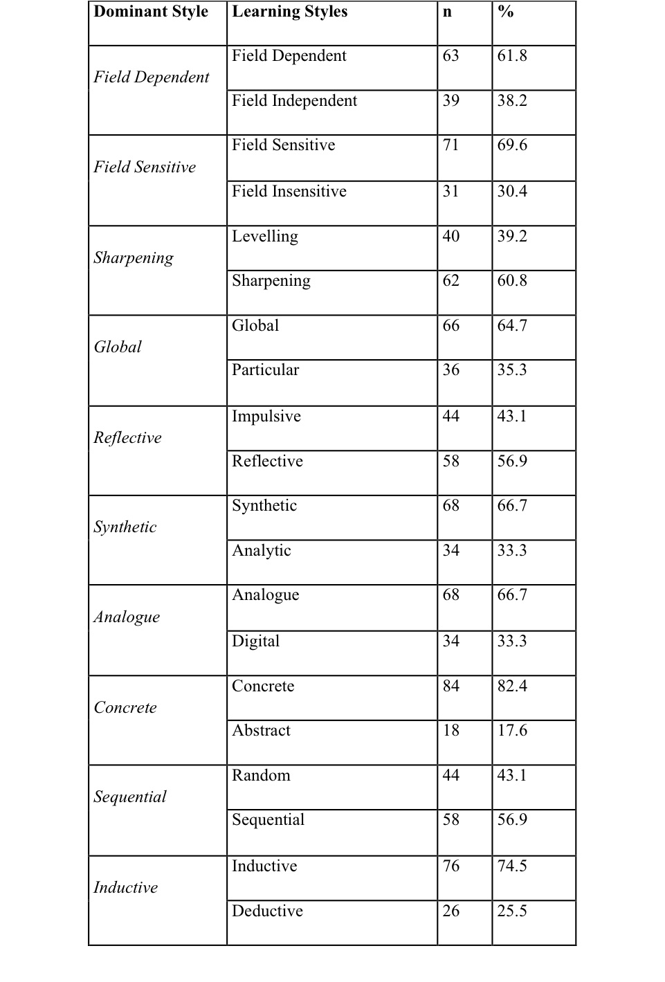 Dominant learning styles of the regular users (n=102) were found to be; Field Dependent, Field Sensitive, Sharpening, Global, Reflective, Synthetic, Analogue, Concrete, Sequential and Inductive. The overall results are given in Table 3:
