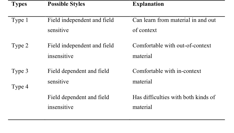 Table 4. Ehrman (1996; 1997) Types of Field Independence and Field Sensitivity