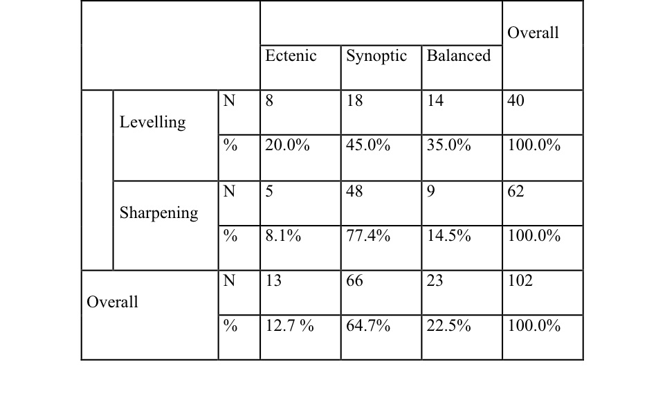 The results obtained from chi-square test indicate that there is a meaningful relationship between general synoptic-ectenic learning tendencies and levelling-sharpening learning style subscale (p<0.05). 77.4% (48 students) of sharpeners were found to be on the synoptic pole. These results imply that the number of synoptic sharpeners who are expected to be successful in learning English is high.