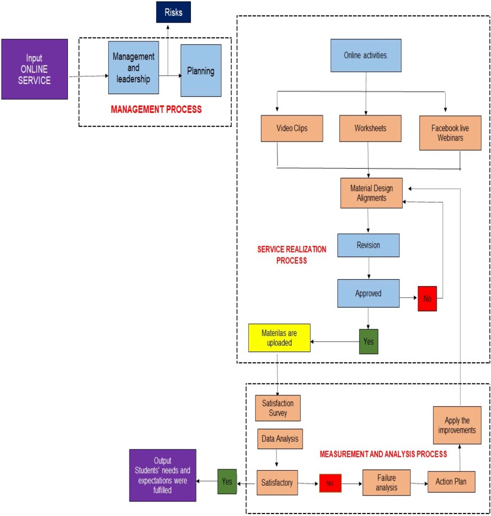 The following flow chart (Figure 1) was designed and adapted as an emergent model based on a main OPM and the principles established by the ISO: 9001:2015. As has been previously explained, the ISO 9001 is an international standardised set of regulations or QMS which has the intention of helping organisations to analyse, control and improve their internal processes. This is the reason why the advising model and the online activities model considered the principles and policies established in ISO 9001:2015 the norm. These policies present a series of protocols which are to be considered when establishing the process to provide a service which includes: resources, support, service provision, evaluation, processes improvement. In addition, it accounts for potential risks that might prevent the organisation, in this case a SALC, from providing services. Figure 1 describes the process advisors from the SALC needed to follow in order to keep providing the advising service.
