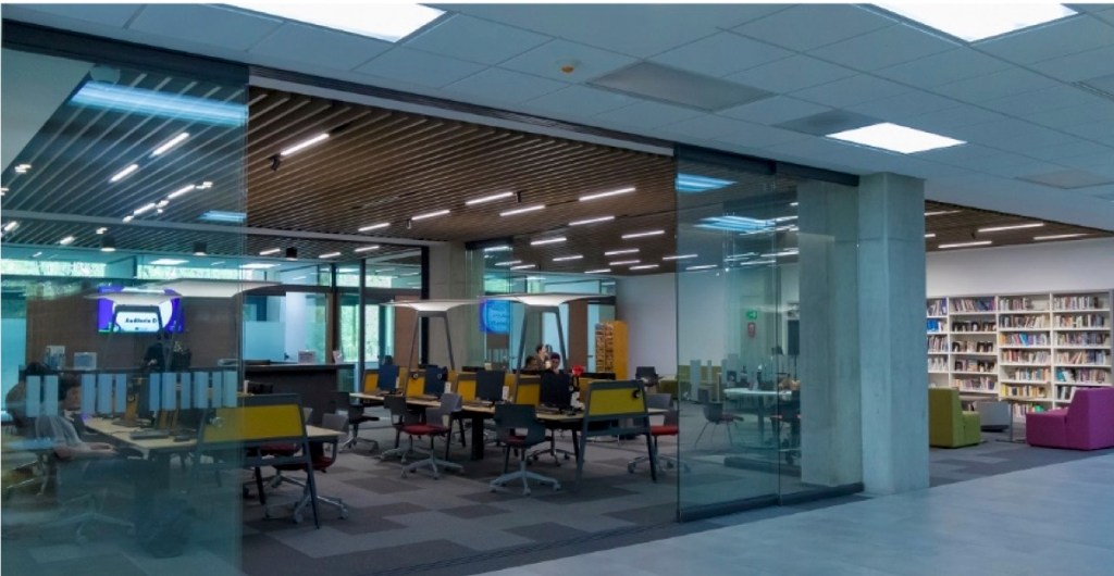 On a regular semester, a variety of options are on permanent offer at the Hub, and they are based out of the physical space on the third floor of the library. One of the most prominent options is the Advising and Tutoring Programme (Programa de Asesorías y Tutorias – PAT) which includes peer tutors (students who can help with English matters or with oral and written communication issues in Spanish), tutors and advisors (for English and for Spanish as a foreign language), on a permanent schedule available at the Hub or by appointment, meeting at the facilities as well. Another popular option is the conversation club. The sessions are usually offered both face-to-face at the Hub or virtually via Zoom. There are sessions to practice general English, academic English, Mexican sign language, Japanese and depending on the number and nationalities of the exchange students on campus volunteering to help, French, German, Chinese, and Portuguese. The facilities of the Hub offer spaces designed for collaborative work and opportunities for socializing. There are materials available for use inside the Hub and they may be taken to other areas within the library, but cannot be borrowed for use outside the building. The materials include a wide variety of text books, exam preparation materials, graded readers in different languages and proficiency levels, audio-visual materials including movies, series, and audiobooks. We have an ever-expanding curated section of novels in their original language that include the most popular and sought-after fiction, suspense, drama, fantasy and Young Adult titles available. The Hub facilities include three semiprivate study spaces, 16 computer stations, 10 iPads loaded with a variety of language practice focused apps, and an open work area (see Figure 1).
