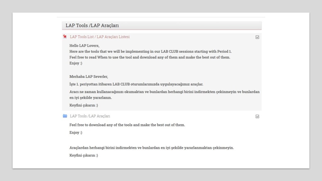 As for the digitalization phase of the LAP unit, we started our preparations for the new academic year, mainly focusing on seeking alternative ways to address more learners and instructors’ needs of building rapport with learners in the academic year of 2020-2021. Initially in this digitalization process, all LAP tools were put into digital formats. In coordination with the other units at AYBU SFL, an LAP Moodle class was created, and all registered students as of the 2020-2021 academic year were assigned as members of this class. All tools, the website content of the unit, and an orientation video for this new academic year were placed into the online LAP class under clearly designated tabs in English and Turkish (see Figure 4).