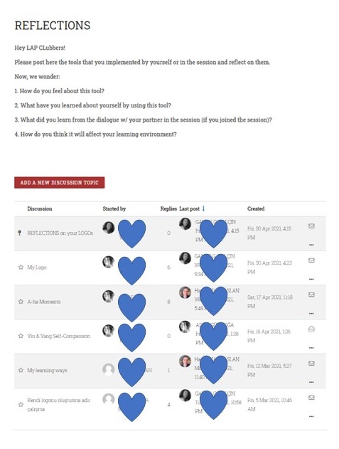 Knowing that learning can potentially take place in any kind of environment from an ecological perspective, we did our best to provide learners with both synchronous and asynchronous environments for learner engagement. Therefore, we created forum discussions in our Moodle class about the LAP CLUB sessions where the participants could reflect on their experiences with the tools and club sessions asynchronously (see Figure 5).