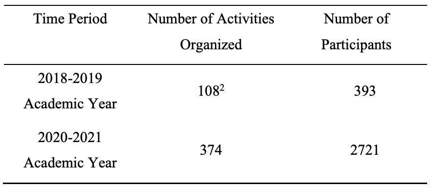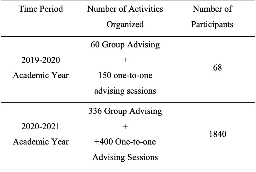 [2] In addition to these figures, 229 individual face-to-face speaking sessions were organized in three periods in 2018-2019 academic year and a total of 206 students showed up in these meetings. These figures were not added up to the total numbers as they were considered different in nature from the activities organized online in 2020-2021 in times of COVID-19.