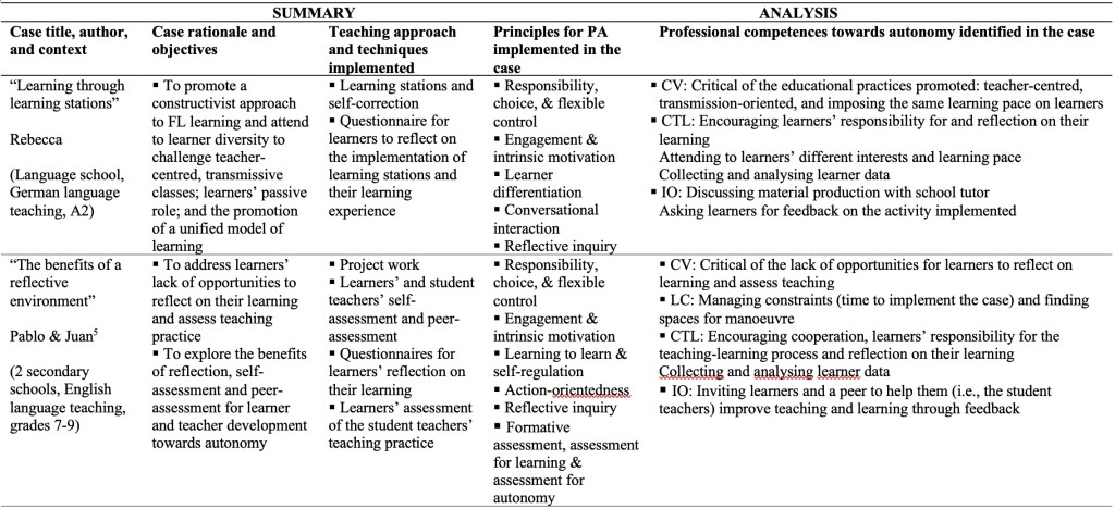 The cases were first analysed independently by both researchers. The analysis was thematic and was based on examining the student teachers’ development of PA and professional competences towards autonomy in their cases. On the one hand, the principles for the development of PA formulated by Jiménez Raya et al. (2017) were used to analyse the implementation of this approach in the student teachers’ cases. These principles for PA include:
