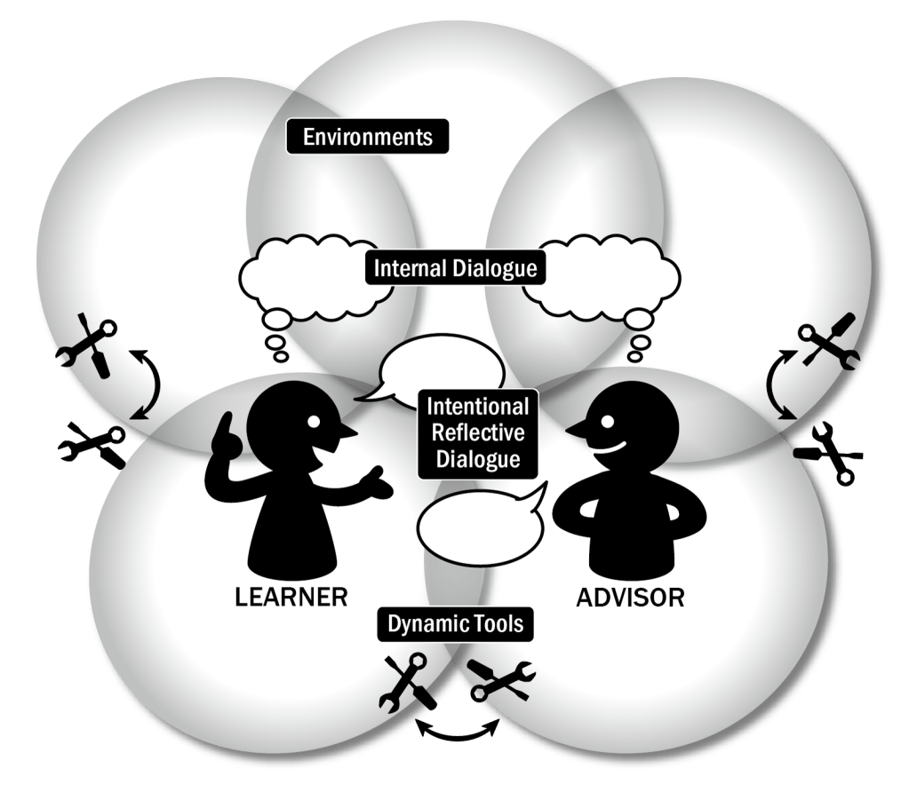 At the core of the advisor-advisee interaction is the “intentional reflective dialogue”, in which the advisor “intentionally activate[s] learners’ reflective processes in language learning” (Kato & Mynard, 2016, p. 6) in order to engage learners in “transformation of learning” (Kato & Mynard, 2016, p. 6). This dialogue intentionally focuses on: