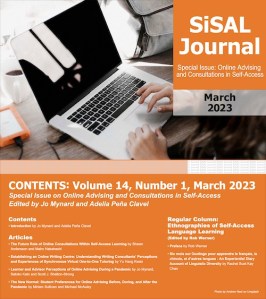 Volume 14, Number 1, March 2023. Special Issue on Online Advising and Consultations in Self-Access. Edited by Jo Mynard and Adelia Peña Clavel