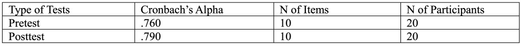 These tests were validated by two Ph.D. holders in applied linguistics who were Omani nationals with 15 years of teaching and training experience in the Omani EFL context. A pilot study was conducted with 20 Omani EFL learners to ensure the reliability of both tests. As can be observed in Table 1, the pretest and posttest implemented in this study are highly reliable, as the results of Cronbach’s Alpha show 0.760 and 0.790, respectively.