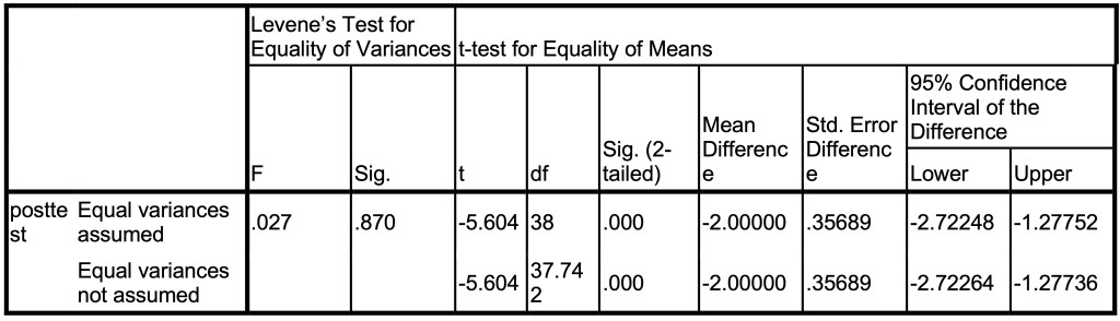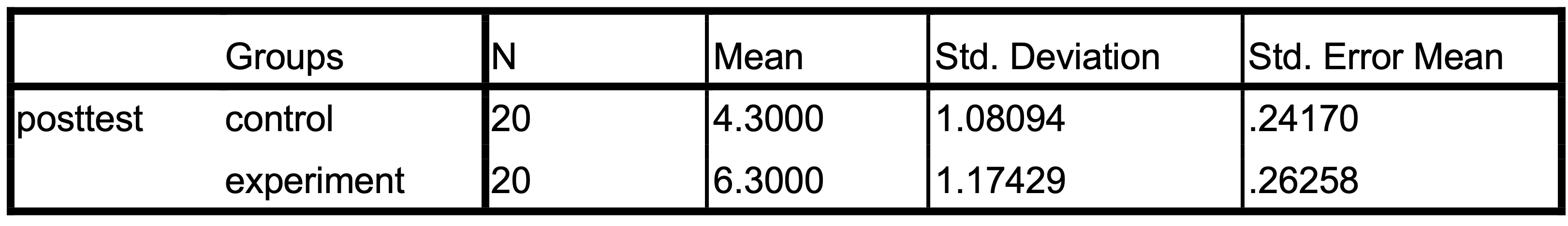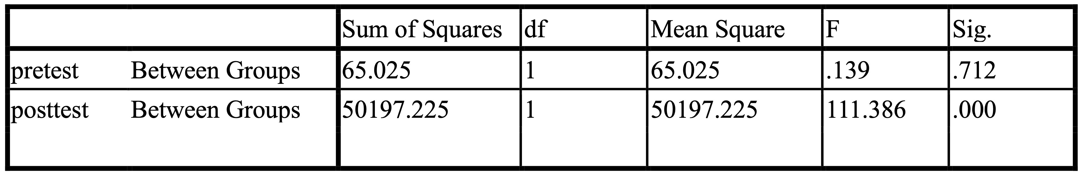 As can be observed from Table 7, the performance of students in both groups in the pretest was similar, showing the answer’s homogeneity. However, since the (p <.05) in the posttest, it can be concluded that there is a difference between the student’s pretest and posttest results. An independent T-test was run to compare both groups in the posttest and