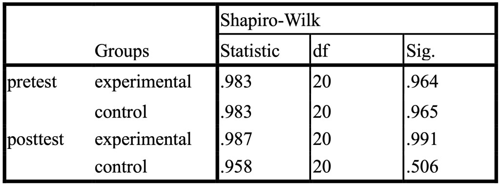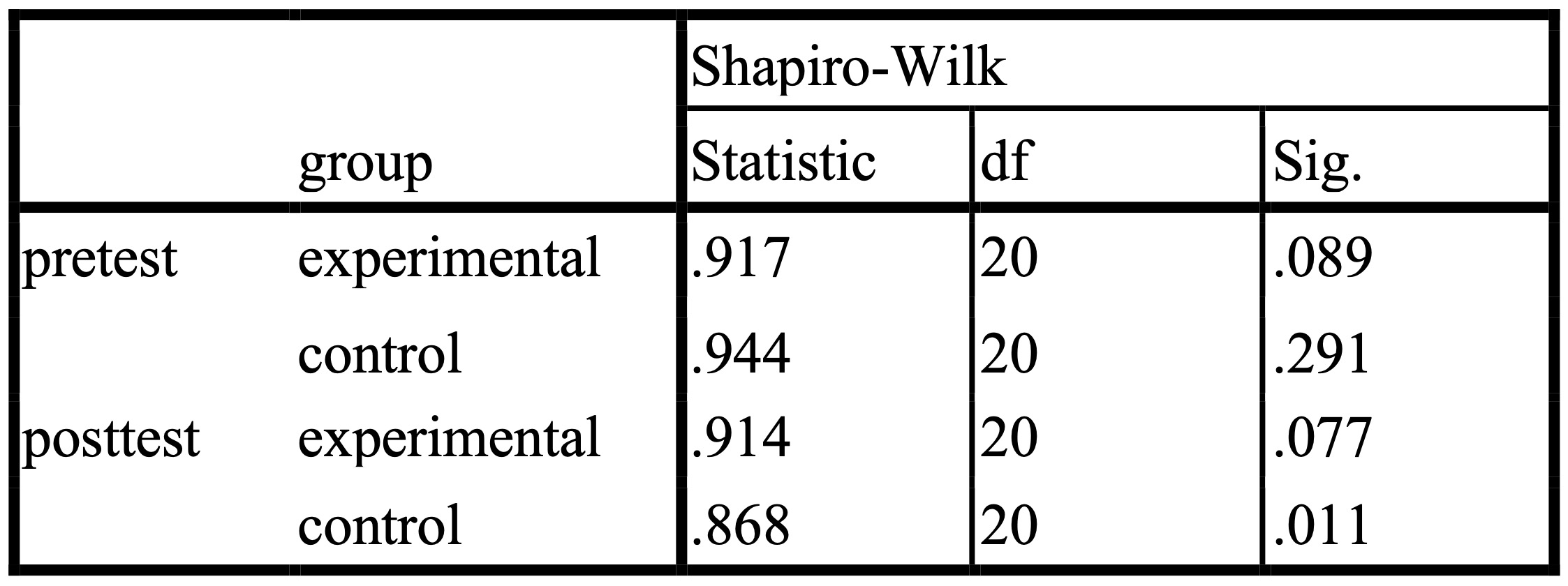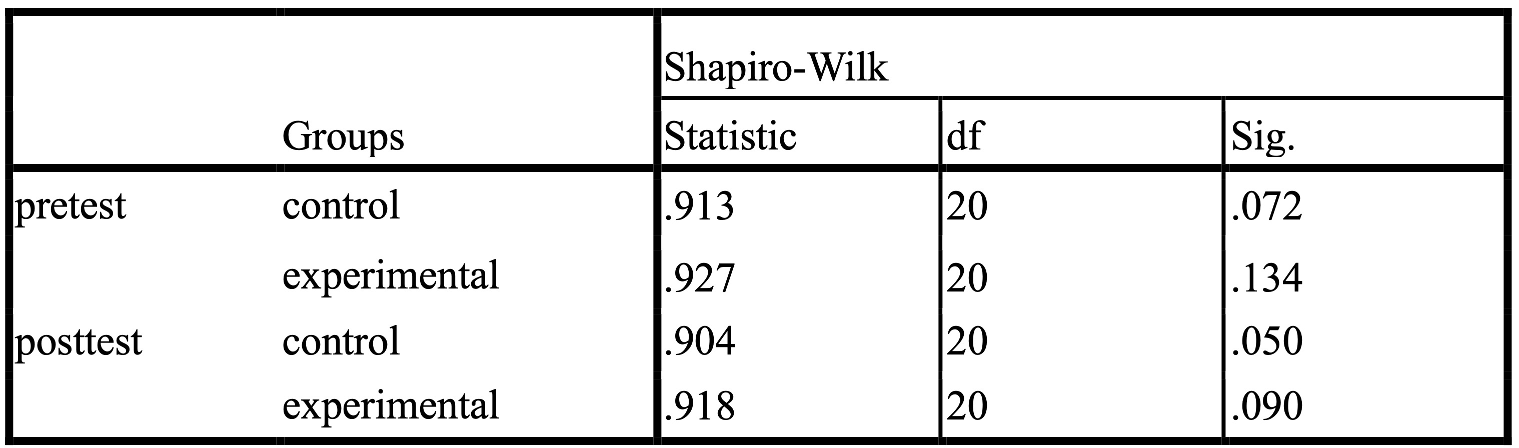The first part of this section analyzes the results of the motivation questionnaire. Before testing the related research hypothesis, it is necessary to find the data distribution’s normality for the pretest and posttest. To do this, the researcher conducted a Shapiro-Wilknormality test; the results are shown in Table 2.