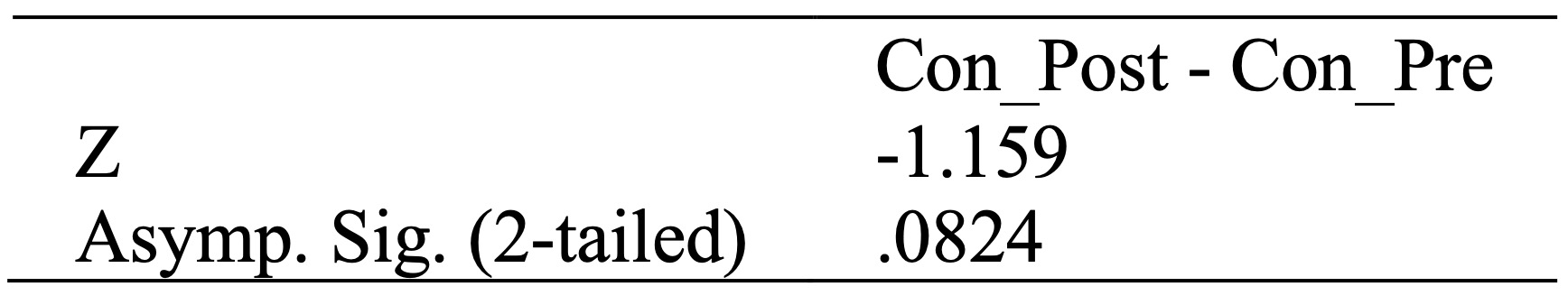 As indicated in Table 9, the normality of distribution was not confirmed for the control group pretest (p> .05). Therefore, the non-parametric Wilcoxon test was used to compare the pretest and posttest. The paired-sample was used to compare the pretest and delayed scores within the experimental group. For the control, only the non-parametric Wilcoxon test was used. Table 10 shows the result of the inferential test for the control group.