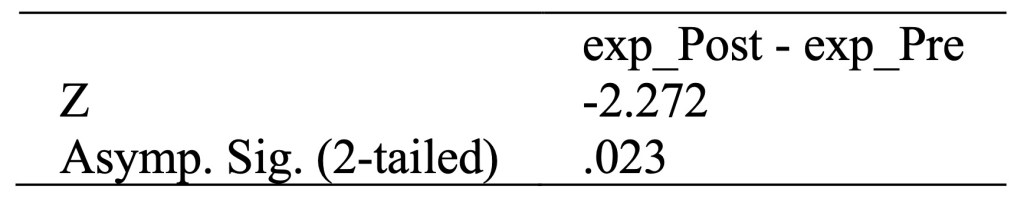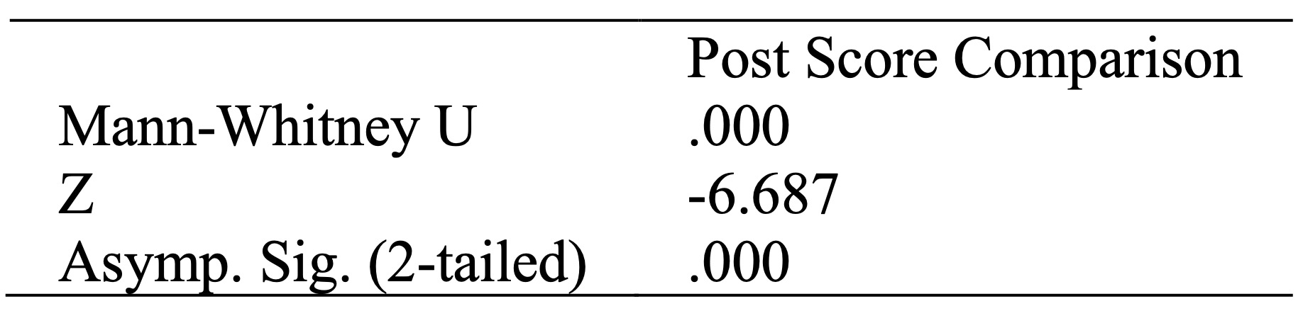 In Table 4, the Wilcoxon signed-rank test showed a statistically significant difference between the pretest and posttest of the experimental group (Z = -2.79, p <.05). The next table compares the scores between the control and experimental groups.