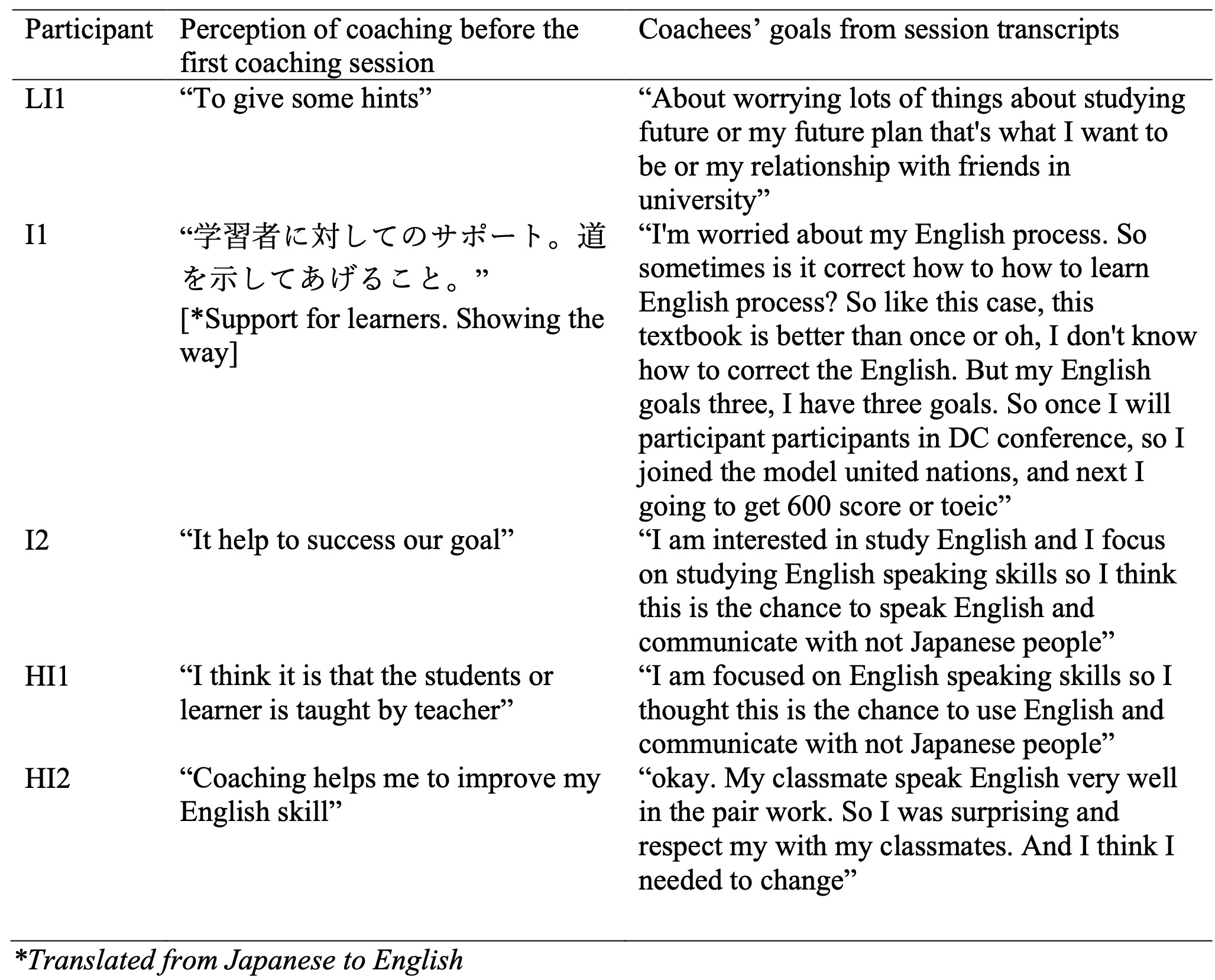 Similarly, participant I2 viewed coaching as a way to help them achieve their goals, and their session goal was to improve their English-speaking skills by communicating with non-Japanese people. This suggests that they saw coaching as a tool that could help them reach their objectives.