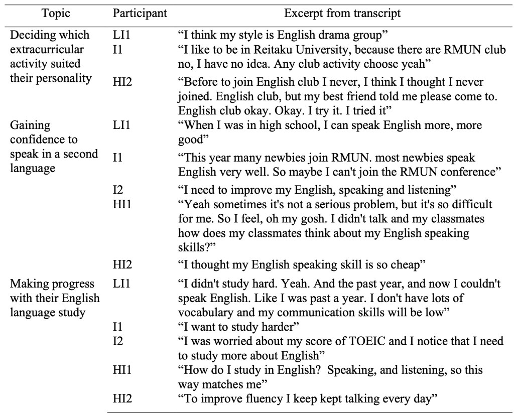 The participants’ topics fell into the following themes: deciding which extracurricular activity suited their personality, gaining confidence to speak a second language, and making progress with their English language study. Table 2 shows the theme with the participant’s responses.