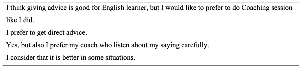 During this study, the participants felt the benefits of coaching in English as a second language but also some dissatisfaction shown in Table 4. The language barrier was an issue with the participants despite the coach being a language teacher. In particular, the coachees mentioned that it was difficult to come up with the vocabulary, especially when expressing their feelings.