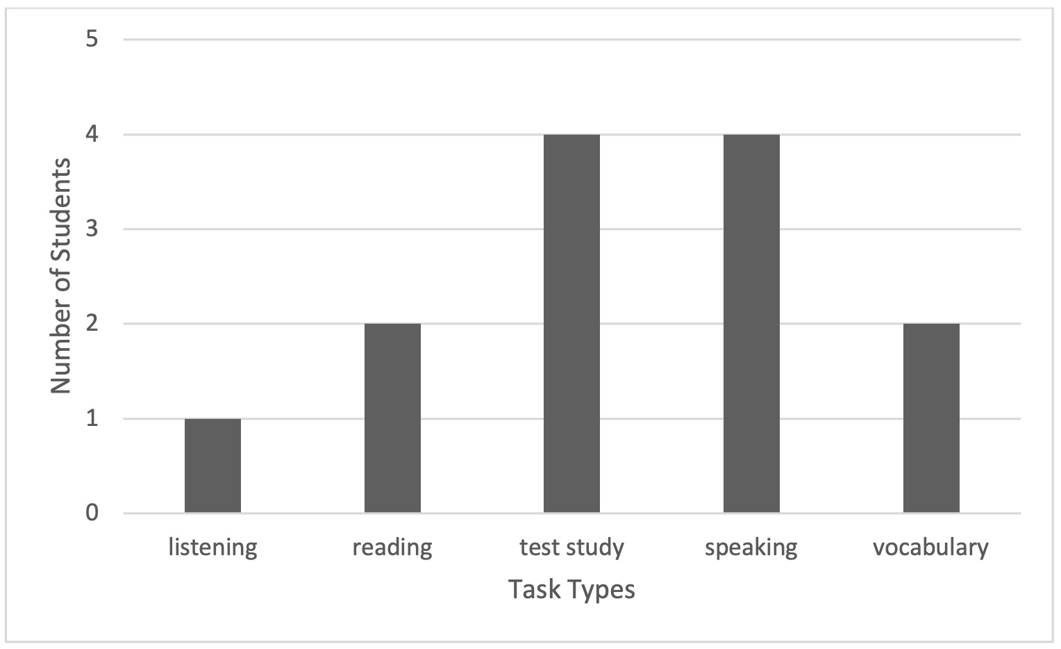 Students were asked to comment on how many tasks they felt they could complete in a typical week throughout the semester. Results can be seen in Figure 4. Most responded that two or three would be possible weekly across the semester. These students are not English majors, and this course accounts for one of over 20 credits worth of courses they are taking in a semester. As such, this seems a realistic and achievable total. It may also be influenced by their task choices and the amount of time spent on each, which, as shown above, was highly variable. Indeed, some learners even stated that they could do more than the five that they did in the week of the 7-Day Challenge, with one learner stating, ‘I often study English, so I am not difficulty the tasks.’