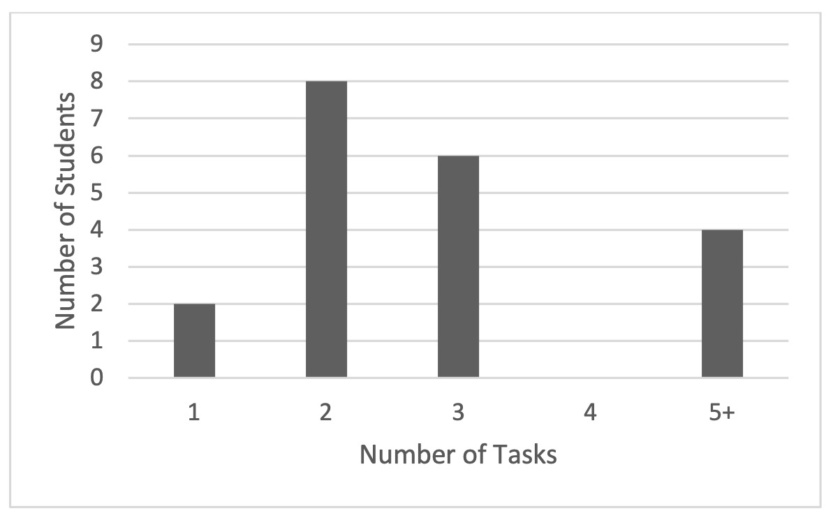 Below, the initial descriptive statistics on task completion are presented. With a class of 26 students, there are a maximum of 130 possible independent learning tasks that could be completed. However, two students did not complete any tasks, leaving a potential total of 120 tasks that could be completed. Of this total of 120, 116 were submitted, at a submission rate of 96%. 57% of students chose to focus on a single skill for all five tasks, and 47% chose at least two different skill areas. 20 of the 26 students submitted the reflection questionnaire.