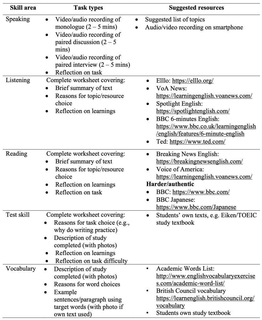 Thus, in order to develop skills in autonomous learning and begin to establish a learning habit, a programme of independent learning which culminated in the ‘7-Day Challenge,’ partly inspired by a well-known TED talk ‘Try Something New for 30 Days’ (Cutts, 2011), was implemented. The 7-Day Challenge itself began towards the end of a 14-week semester and required the learners to complete and submit five independent learning tasks of their choice over seven days. Although the literature above states that it takes considerably longer than seven days to fully establish a habit, course constraints meant that there was little time left before the end of the semester for a more ambitious time frame. Also, in the run-up to the main 7-Day Challenge, learners had completed a number of individual self-directed learning tasks. As such, the 7-Day Challenge was intended to bring the course to a close with an intensive focus on independent learning, with the hope that the experiences of the week, would serve as a trigger for future habit development. The tasks that made up the challenge were organised by skill area, and learners could choose to focus on one skill area only, for example, by doing five speaking tasks, or they could do a combination of tasks. A range of resources and task ideas were provided, but learners could use other resources or their own tasks. Table 1 summarises the skill areas, task ideas and resources. There was no writing option included as in a needs analysis on the skill areas learners most wanted to improve, none mentioned writing.