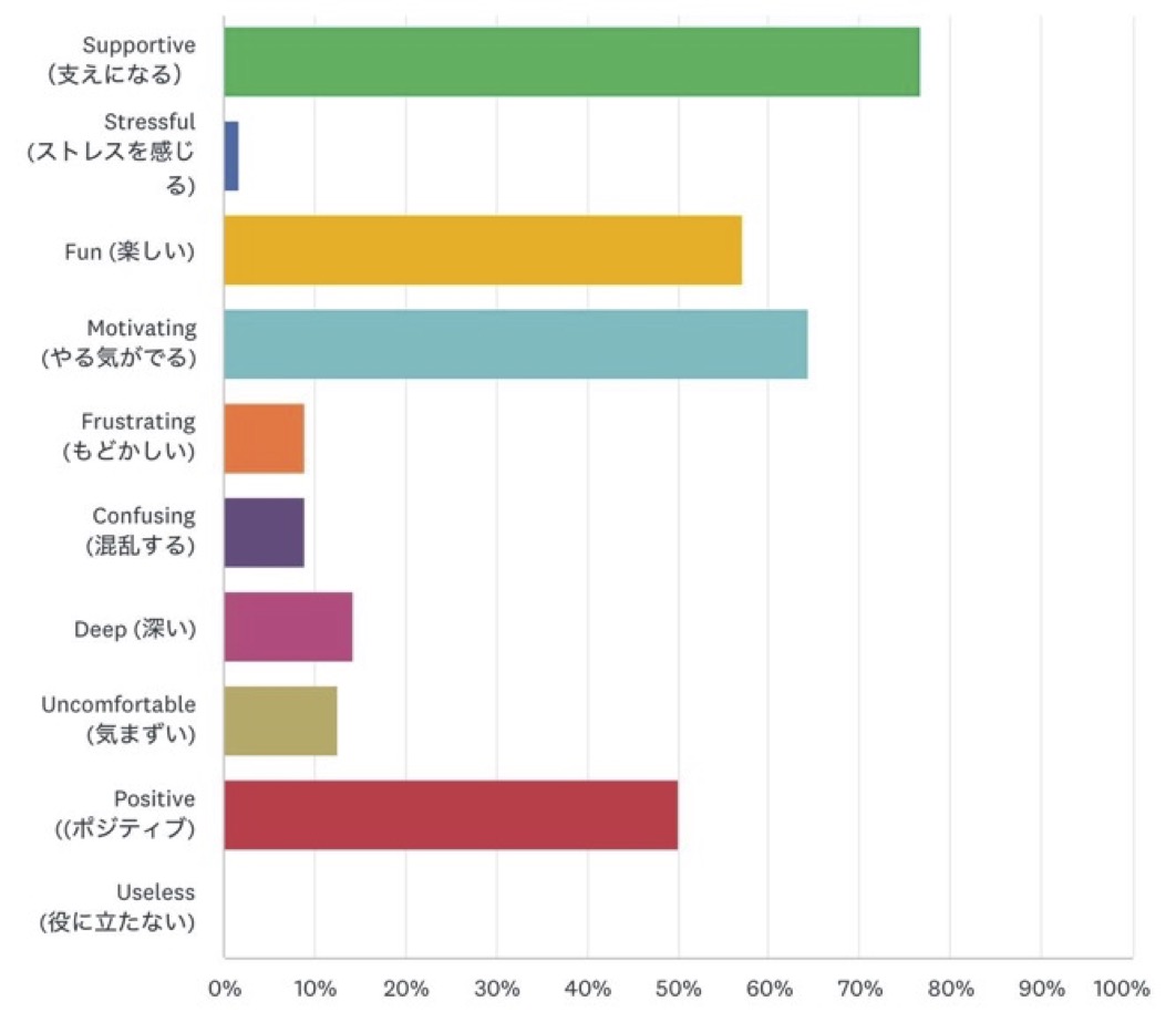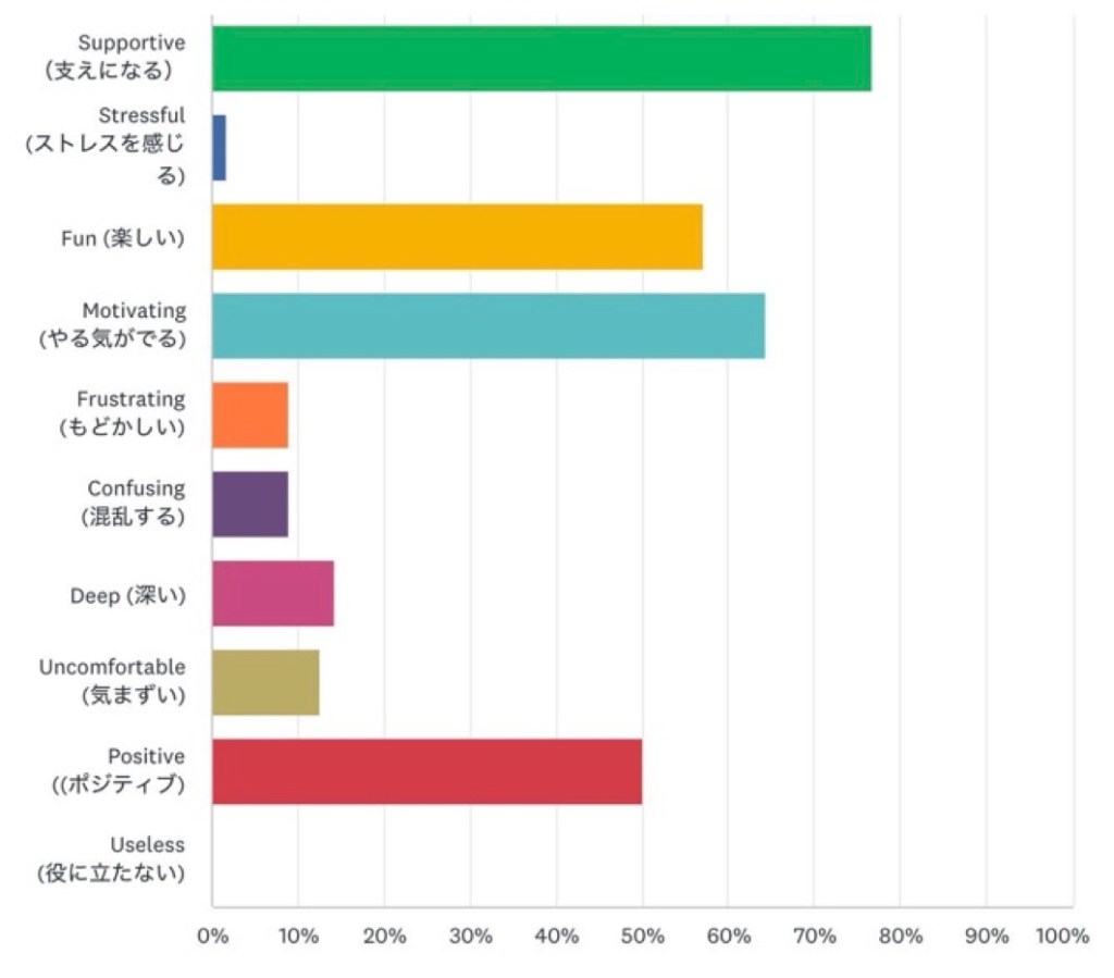 The final open-ended question asked students to comment on how they felt about their experience of advising that semester. In total, 55 participants responded to this question, and in 46 of the responses, they commented on at least one need-supportive aspect of the interaction with learning advisors. A further seven of the comments were either neutral or unclear, and two comments discussed a drawback of online advising, for example, “実際に会って話す方が楽しいです”[It’s more fun to actually meet and talk.] The predominantly positive comments indicate that learning advisors were succeeding in providing a positive and autonomy-supportive climate even online. These three excerpts capture the generally positive overall experiences of the students.