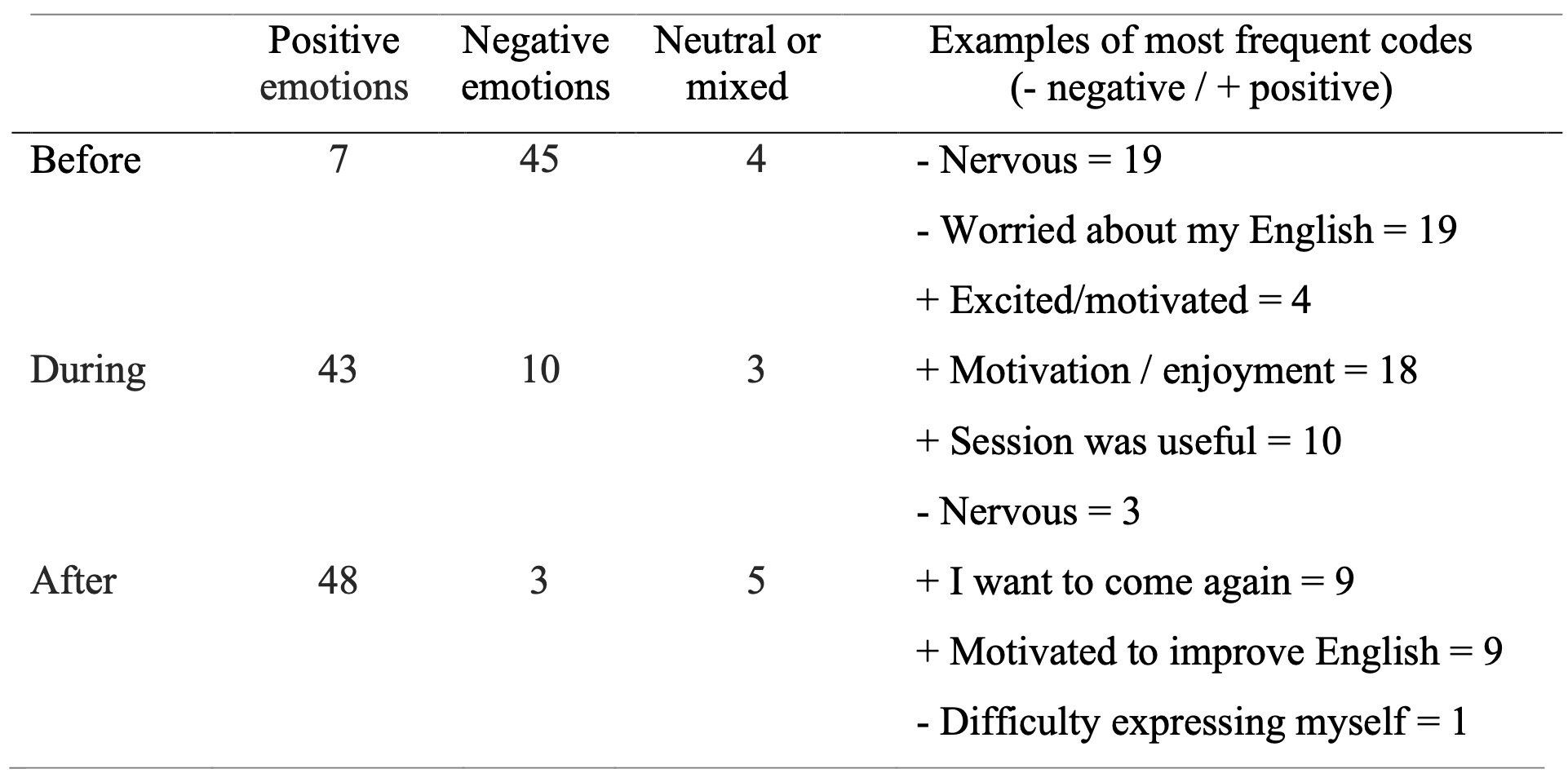 When we explored how participants felt about online advising before, during and after attending a session, we found that feelings changed for the 56 participants who responded to this question. We discovered that before a session, 45 students felt negative emotions. For example, they felt nervous (n=19) or unsure about their language skills (n=19). During the session, participants tended to feel motivated, comfortable and supported and, in all, 43 students reported positive emotions. After a session, participants generally reported positive emotions (n=48). For example, they felt motivated to attend more sessions and to improve their English and were satisfied with the support they received from learning advisors. Negative points highlighted by students tended to be related to dissatisfaction with their language skills rather than the support they received from learning advisors or with the technology. A summary of this data is shown in Table 1.