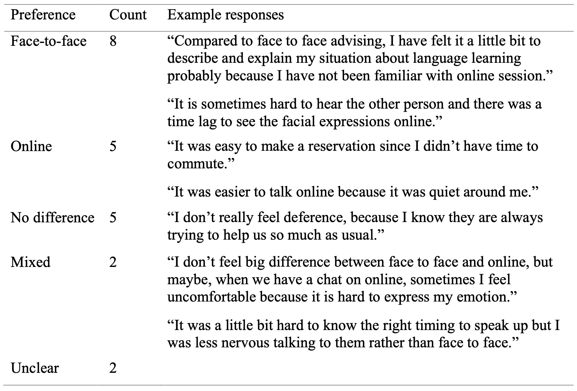 When comparing online advising with face-to-face advising by students who had experienced both (n=22), we found that responses were mixed as shown in Table 2. Eight students preferred face-to-face advising as they could express themselves more easily. One of these respondents reported that the time lag and the difficulty of viewing facial expressions online contributed to a preference for face-to-face advising. In addition, the unfamiliarity of the online advising mode seems to have been a factor for at least one participant. Five students preferred online advising due to convenience. One respondent noted, “I think the online advising was as good as the face-to-face session because I was able to receive URLs for useful materials and websites through the chat function.” One respondent even reported feeling less nervous during online advising sessions. Five students did not perceive there to be a difference at all and appreciated feeling supported by learning advisors regardless of the mode.