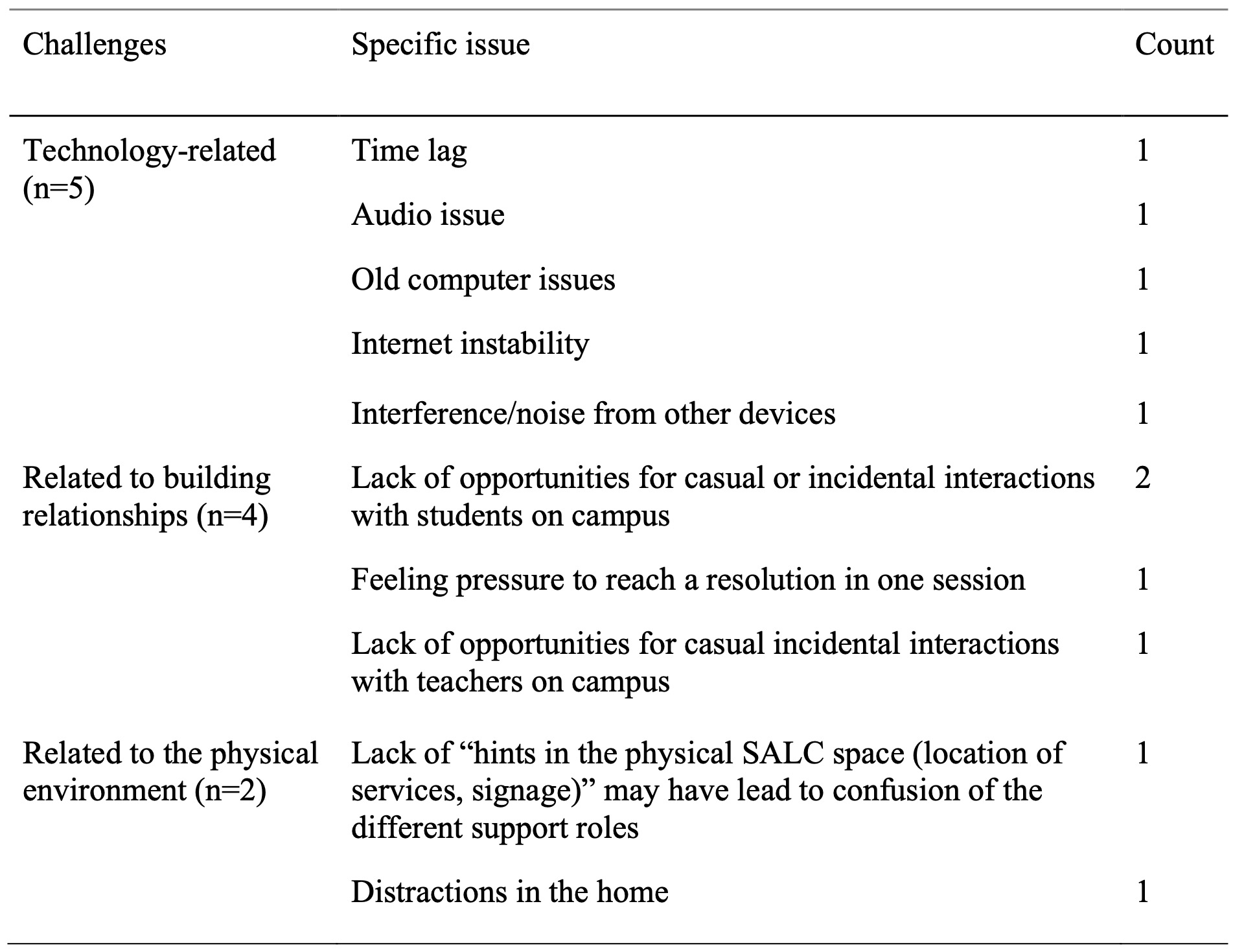The learning advisors mentioned some general challenges, such as occasional audio distortion and the absence of non-verbal cues from body language and eye contact. A couple of them mentioned the challenge of not being able to make deep connections with learners or casually talk to teachers easily as everyone was working from home. One person mentioned that they felt some pressure to reach a resolution in one session when, usually, a learning-related issue may be discussed over several sessions in face-to-face advising sessions. Table 4 shows a summary of all the responses. Some learning advisors mentioned more than one issue. It is possible that the respondents did not report all the challenges they experienced, as these were often discussed in the weekly meetings and were considered common knowledge among the advising team. These were issues such as fatigue, eye strain, backache, or other conditions caused by working alone or on a computer for longer periods of time than usual.