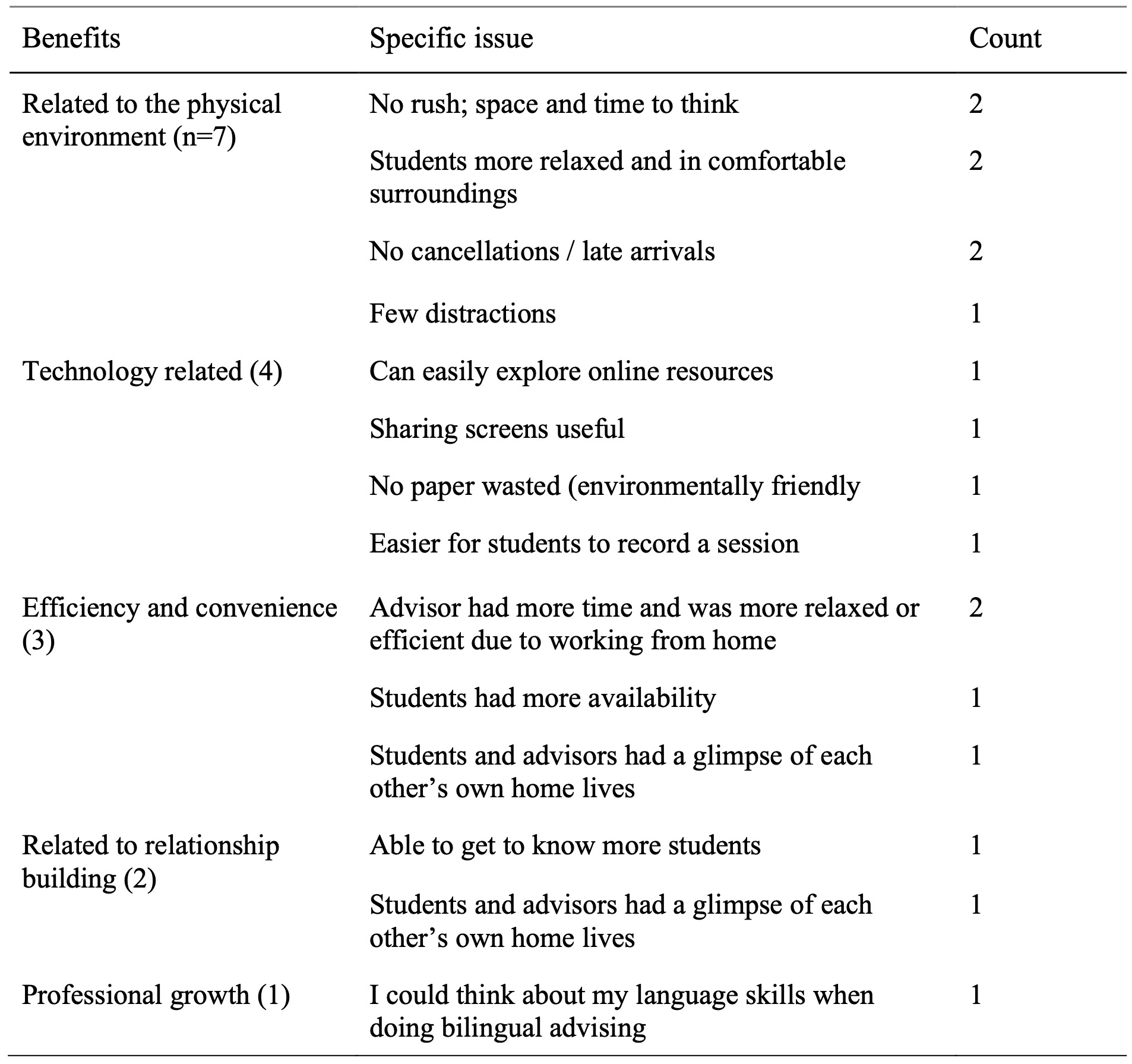 Everyone mentioned at least one benefit of online advising. Seven of the comments related to the physical space; for example, students were able to attend sessions from their own bedrooms at home, which made the sessions quite relaxed. One participant claimed that the quality of reflection online was deeper because “there are fewer distractions compared to being on campus. Neither of us are in a rush to be elsewhere. Both of us are in our own space, at home.” In addition, a couple of learning advisors mentioned that there were no cancellations or late students for the entire semester. Four people mentioned the pedagogical affordances of the technology, such as being able to download the notes from the whiteboard after a session and the ease of making video recordings of the session for students to review later. Other responses are summarised in Table 5 and were related to efficiency and convenience, relationship building or professional growth.