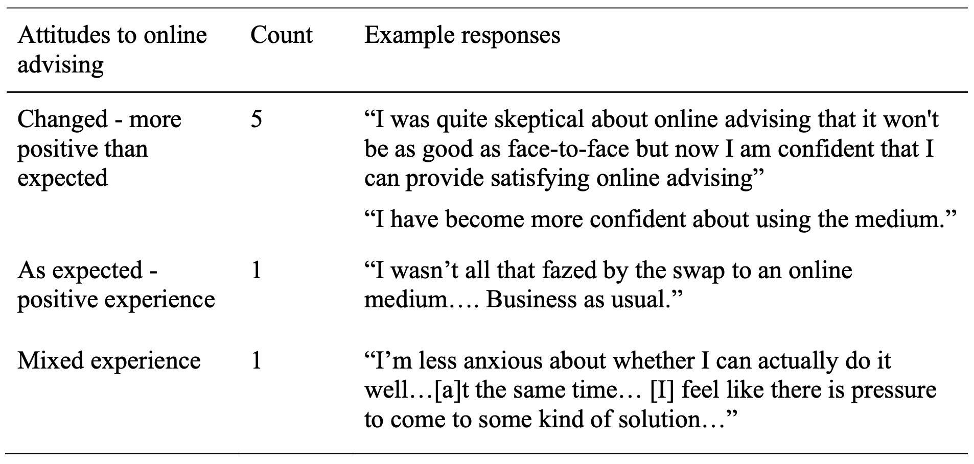 As Table 6 shows, out of the seven respondents, five of them reported having changed their attitudes to online advising for the better, for example, becoming more confident that their advising was supporting students, like this excerpt from the data shows: