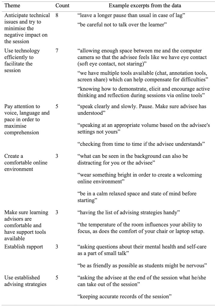 Regarding managing an online session, learning advisors shared some practical information that we have summarised in Table 7. The learning advisors suggested many of the same practices that similarly apply to-face-to advising, such as being as friendly and welcoming as possible and keeping good notes about the session. Many suggestions either made use of the affordances of the online medium, such as being able to annotate documents and share the screen. Learning advisors also provided solutions to the challenges of advising in online mode, such as taking care to avoid overlapping speech or tips for overcoming the lack of real eye contact. Some other suggestions were related to supporting isolated students during a global pandemic, such as this example: