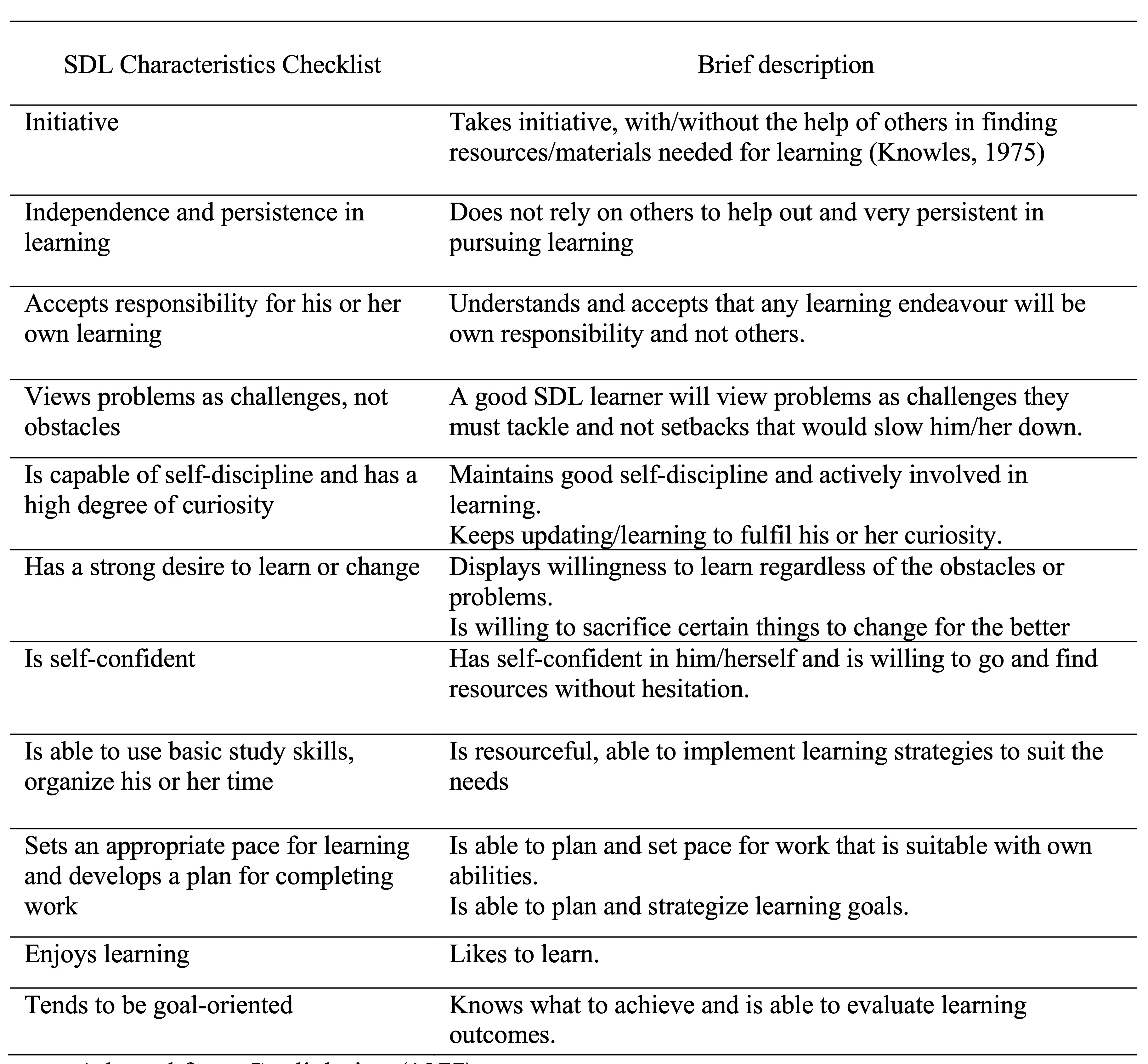 The characteristics of highly self-directed learner can be summarized in Table 1 based on the characteristics proposed by Guglielmino (1977).