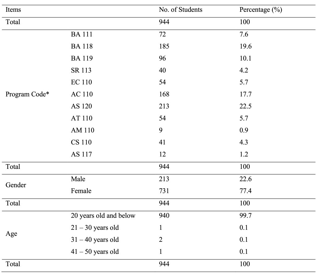 Table 2 displays the demographic information for this study. A total of 944 respondents were involved, and the highest number of respondents were from the AS120 (Science) program, followed by BA118 (Business) and AC110 (Accounting), with 213, 185, and 168 respondents, respectively. The number of respondents for other program codes was less than 100. There were 731 female respondents and 213 males, and the majority of them were below 21 years old, two of them were between 31 and 40 years old, and there was one respondent from each of the 21–30 years old and 41–50 years old ranges.