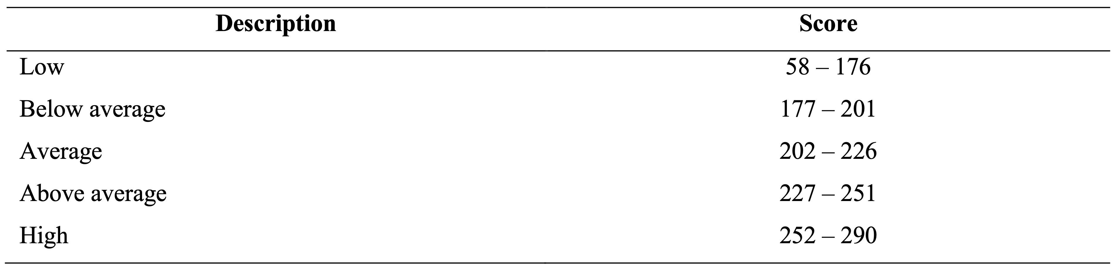 The SDLRS yields one total score ranging from 176 to 290 can be interpreted against a norm (Guglielmino, 1977). According to Beitler (2000) the average score for adults who complete the SDLRS is 214. Furthermore, Beitler (2000) provides the scoring range for adults on the SDLRS as shown in Table 3.