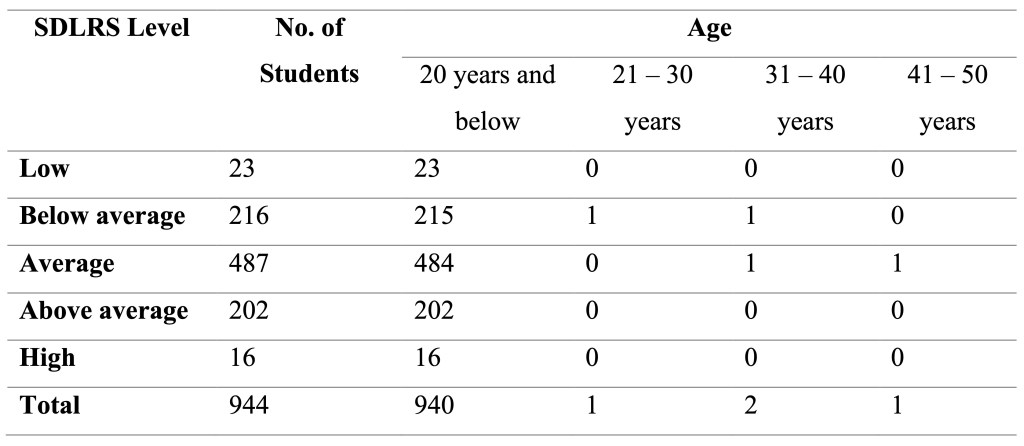 To achieve the study’s objectives, three key research questions have been formulated. The first question seeks to determine the SDL level among undergraduate students. The second question aims to explore whether there are any significant differences in SDL based on age among the undergraduates. The third question seeks to understand SDLR in different programs in the university.