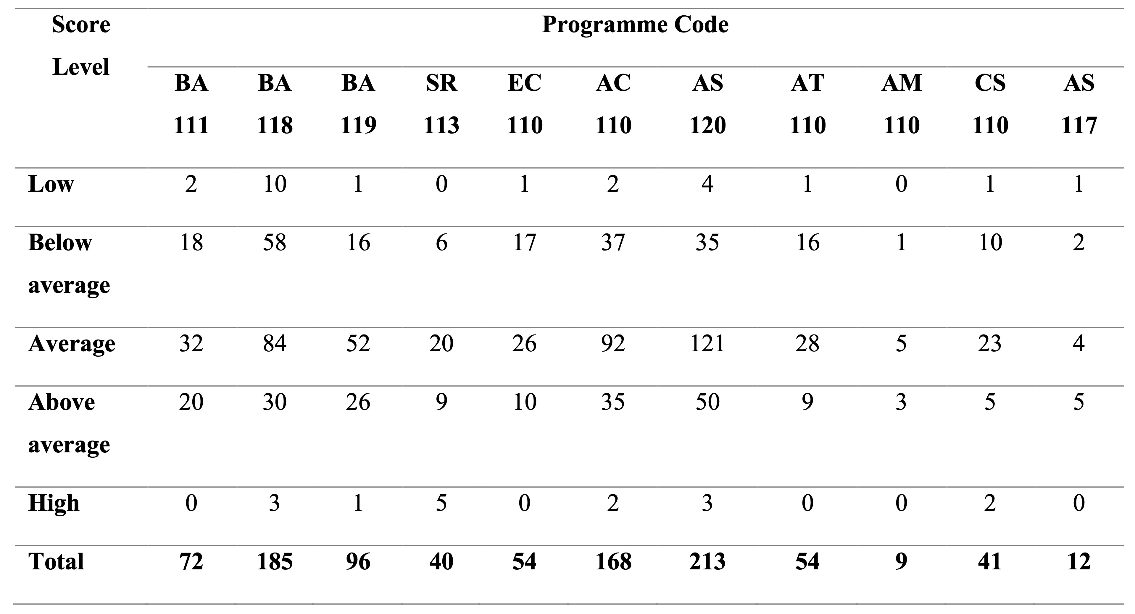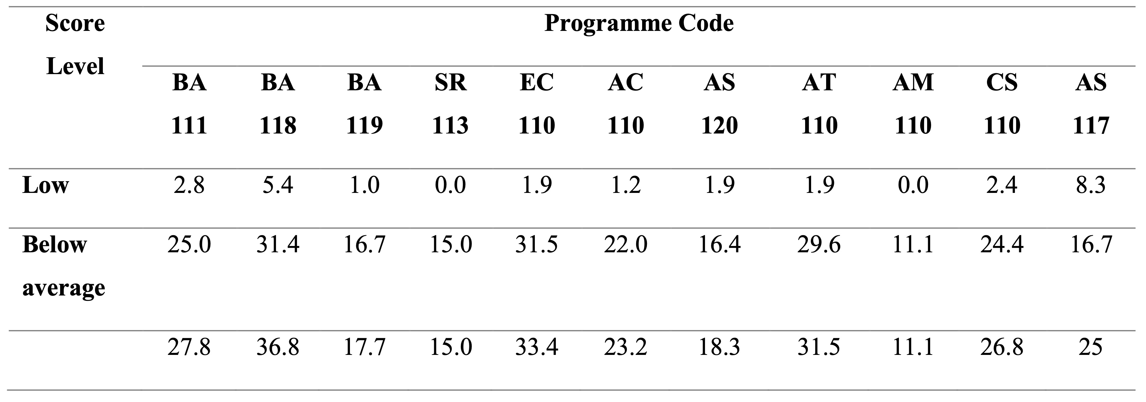 Table 6 displays the SDLR scores based on respondents’ program code. Table 7 shows the number of respondents with low or below-average SDLR scores in each program. The program scoring below the average is BA118 (Diploma in Office Management and Technology). Following closely is EC110 (Diploma in Civil Engineering), and AT110 (Diploma in Planting Industry Management) is in third place. These programs exhibit low or subpar scores on the SDLR Scale (SDLRS), and students in these courses typically gravitate towards highly structured learning modalities, such as conventional classroom lectures. Individuals falling into this category need substantial time and attention from the facilitator or instructor.