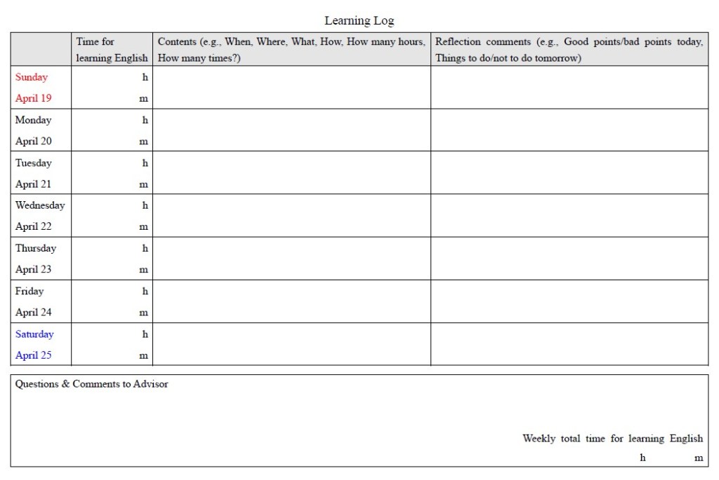 Note. This figure shows an English translation of the Learning Log. The semi-structured ALL program provided learners with an original Japanese version.