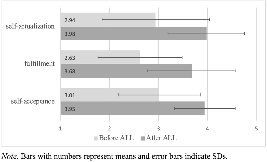 In addition, Figure 5 shows two important findings regarding the means and SDs, similar to the results for Research Question 1. First, the mean scores for self-actualization and fulfillment calculated before the ALL program fell below the central value of the questionnaire (i.e., 3.00 on the 5-point scale), while that for self-acceptance slightly exceeded the central value. Thus, participants evaluated their subjective well-being as nearly neutral or slightly negative. However, these scores far exceeded the central values after the ALL program. Based on the anchors (i.e., 1 = strongly disagree, 2 = disagree, 3 = in-between, 4 = agree, 5 = strongly agree), the participants positively evaluated their well-being. Second, the SDs for self-actualization and self-acceptance calculated after the ALL program were much lower than those before the program. These two results indicate that while the participants showed a wide range of ratings for subjective well-being at a lower level before the program, they obtained higher levels with smaller variability after the program. In other words, part of their well-being improved and uniformly stayed at higher levels thanks to the ALL program, although the post-ALL calculation for fulfillment still showed as large an SD as the pre-ALL one.