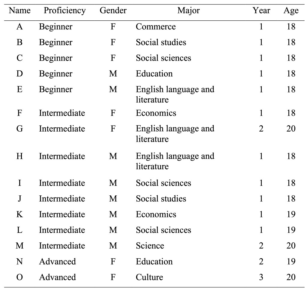 Among the selected 20 learners, 15 completed the entire process of the ALL program, while five dropped out. These five learners may indicate a negative effect of the ALL program. Unfortunately, they did not provide adequate quantitative and qualitative data because they left the program halfway through; therefore, the remaining 15 learners were selected as participants in the present study. Table 3 presents the educational profiles of target learners (participants).