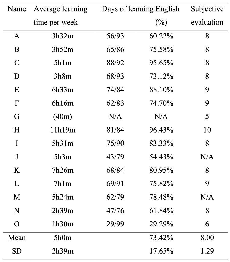 However, some data remain missing. Learner G did not keep her Learning Log well because she was not very motivated to learn English. Her stagnation with the Learning Log negatively affected the fidelity of the data on the average learning time and days of learning English as they were calculated from the Learning Log. Nevertheless, her data remain important in discussing the effects of the ALL program because she obviously had much less average learning time than the other participants. Therefore, this study uses her calculated average time, although it partially suffers from the fidelity issue (i.e., bracketed 40 minutes in Table 4). Meanwhile, cells for days of learning English remain N/A, considering the low fidelity. Learners J and M did not participate in Voices from Learners. Thus, the cells used for the subjective evaluation of the change in learning time before and after the ALL program in Table 4 include two N/As. The means and standard deviations (SDs) in Table 4 do not include N/As.
