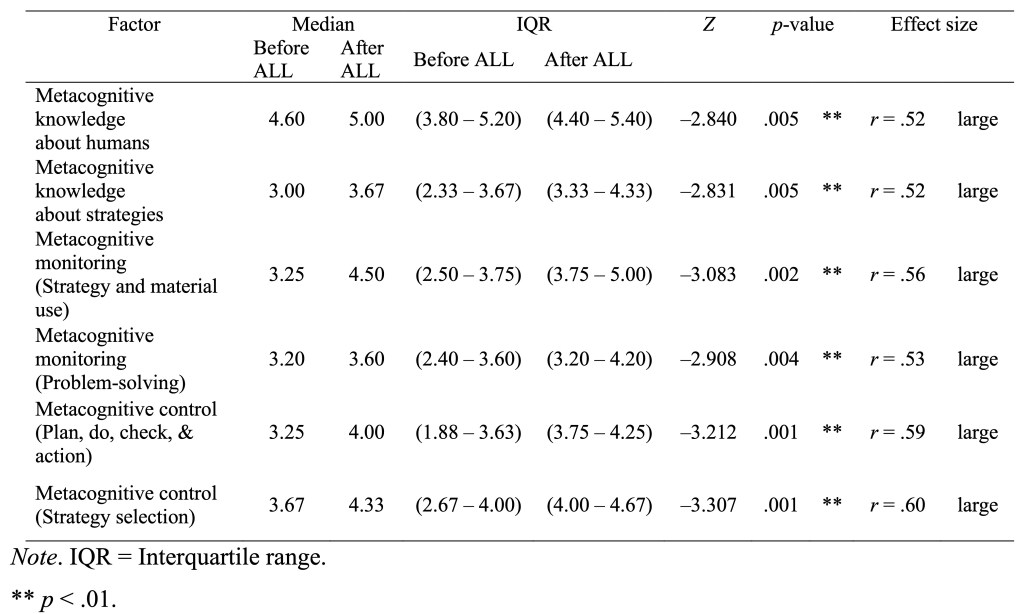 Table 5 shows the results of the participants’ metacognitive abilities measured on the 6-point scale questionnaire (Yasuda, 2016). The medians for all factors were compared using the Wilcoxon signed-rank test.7 The results showed significant before-after increases at the 1% level for the semi-structured ALL program, with large effect sizes for all six questionnaire factors.