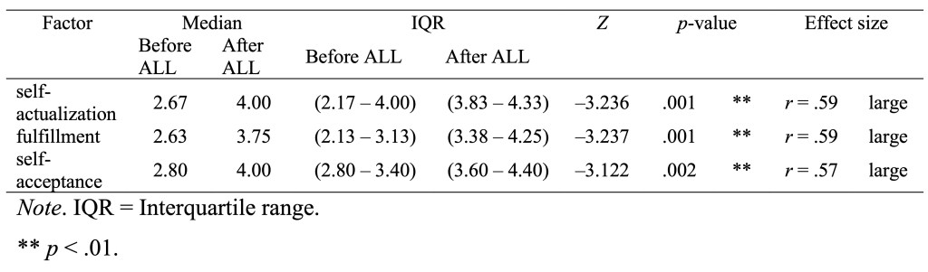 The present quantitative analysis used Yasuda’s (2015) 5-point scale questionnaire to investigate the effects of the semi-structured ALL program on learners’ subjective well-being. The medians for all the factors were compared using the Wilcoxon signed-rank test.7 Table 6 shows significant before-after increases at the 1% level for the program, with large effect sizes in all three factors of the questionnaire.