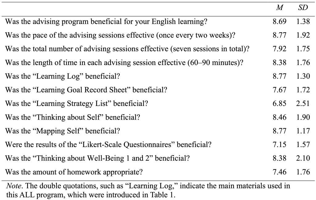 The 12 questions used to investigate the third research question are divided into four groups to make its discussion more understandable. The first group comprises only one question that investigated the overall usefulness of the semi-structured ALL program: “Was the advising program beneficial for your English learning?” For this question, the participants responded with a high rating (M = 8.69) and provided many positive evaluations in the questionnaire’s free-description area as qualitative evidence: “I became conscious of how my current learning strategies functioned” (Learner E). “Although I did not know how to learn English, I organized (related information) by myself (through the ALL program) and successfully produced my own English learning program” (Learner D). “(The ALL program) was very useful because my mind about English turned 180 degrees as I have successfully obtained objective views on my learning process” (Learner H). “I could revise the learning strategies I had used and find some new ones” (Learner K). “I have never had such an experience as I think deeply about myself day and night” (Learner N). “The ALL program was very useful because I did not know how to start my English learning at all” (Learner L).