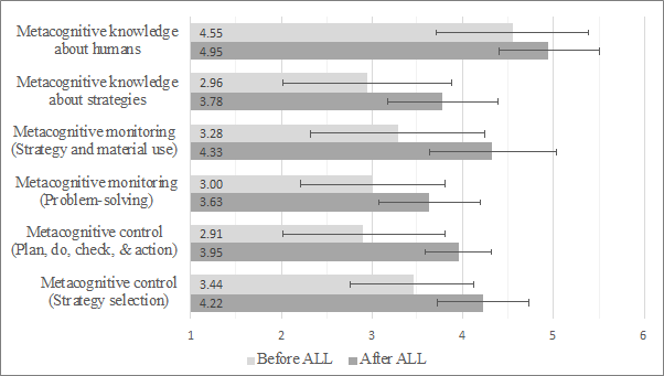 Figure 4 shows two important findings regarding the means and SDs of the six factors. First, while all the mean scores calculated before the ALL program, except for metacognitive knowledge about humans, fell below the central value of the questionnaire (i.e., 3.50 on the 6-point scale), they exceeded the central value after the program. Based on the scale anchors (i.e., 1 = strongly disagree, 2 = disagree, 3 = slightly disagree, 4 = slightly agree, 5 = agree, 6 = strongly agree), the participants evaluated themselves negatively before the program, putting their marks on the disagree side, and positively evaluated themselves after the program, that is, on the agree side. Second, the SDs calculated for the post-ALL questionnaire were much lower than those calculated for the pre-ALL questionnaire. These two results indicate that while the participants showed a wide range of metacognitive abilities at a lower level before the program, they obtained higher levels with smaller variability after the program. In other words, their metacognitive abilities improved and remained homogeneous at higher levels thanks to the ALL program.